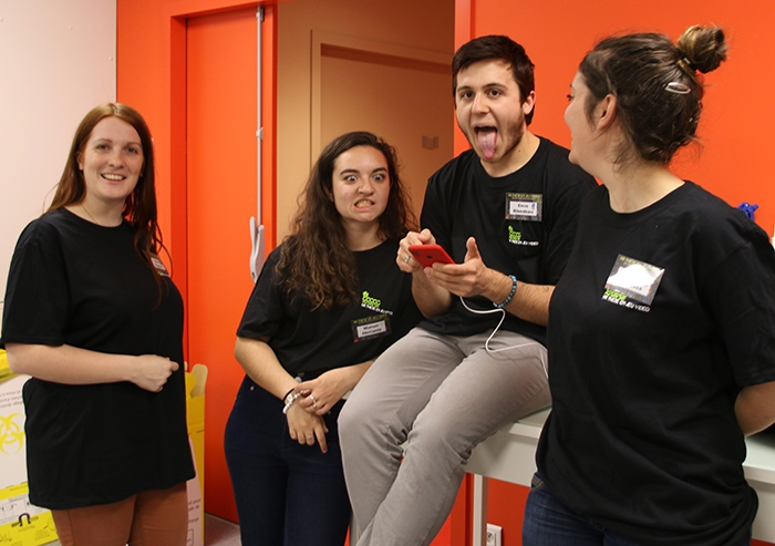Animateurs: Marie Péquignot (chercheuse Inserm à l’INM, Médiatrice scientifique à Genopolys) ; Magali Kitzmann (Chercheuse CNRS, responsable Culture Scientifique à Genopolys) ; Enzo Blondeau (indépendant de la culture scientifique) et deux membres du personnel de l’INM, laura Dumas et Mélanie Quiles.
