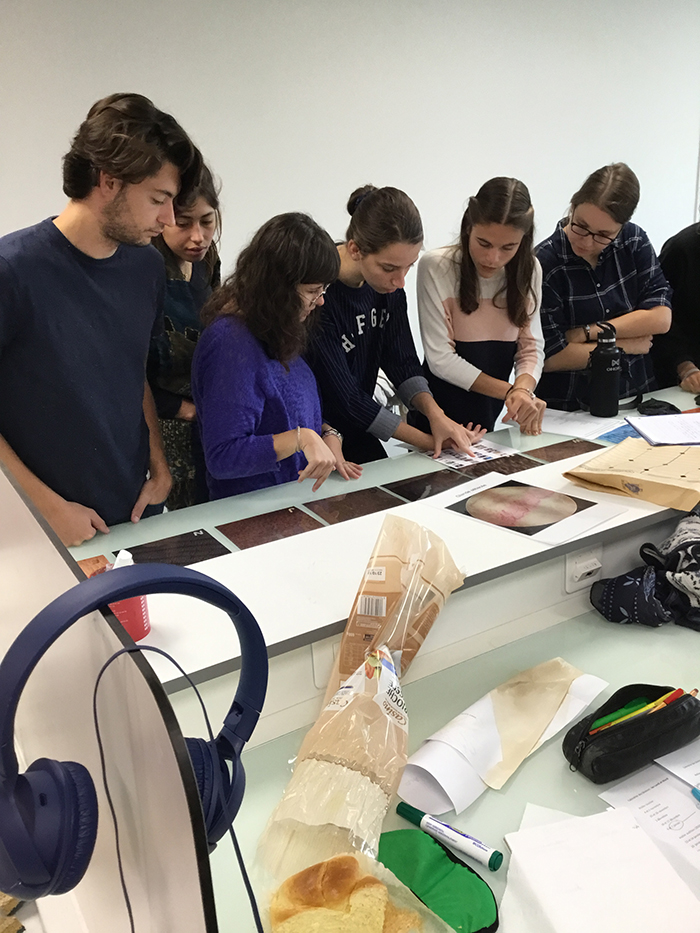 Formation sur les ateliers « toucher » et « audition » pour le projet « 10 classes, 4 sens » par Magali Kitzmann (Chercheuse CNRS, responsable Culture Scientifique à Genopolys) et Marie Péquignot (chercheuse Inserm à l’INM, Médiatrice scientifique à Genopolys) devant l’association MEDIOS (association des étudiants du Master ACCES) à Genopolys pour que des professionnels de la médiation scientifique nous assistent dans l’animation des 40 journées.